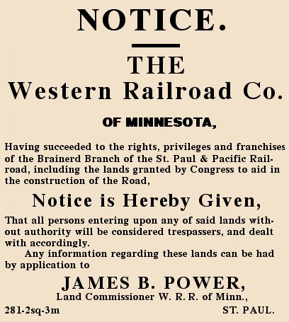 As additional to the speeches of others, we believe we violate no confidence in giving the substance of a conversation with Judge Woodbridge, of Vermont, one of the directors of the Northern Pacific, which occurred while he was riding through and seeing the town. Parties interested in the Central and Union lines, he said, had represented to Eastern capitalists that the route of the Northern Pacific was through a barren and untillable country. The purpose of this trip was to demonstrate the contrary to be the fact. Of the result of their examination he had, from his observation thus far and from what he had learned, no doubt. “The Northern Pacific will be built. It will be built from Lake Superior to St. Cloud sooner than you think for. If this report be favorable, as we expect it will be, men will be put on the work at the earliest possible day next season. This is the great national highway across the continent, as any man can plainly see.”